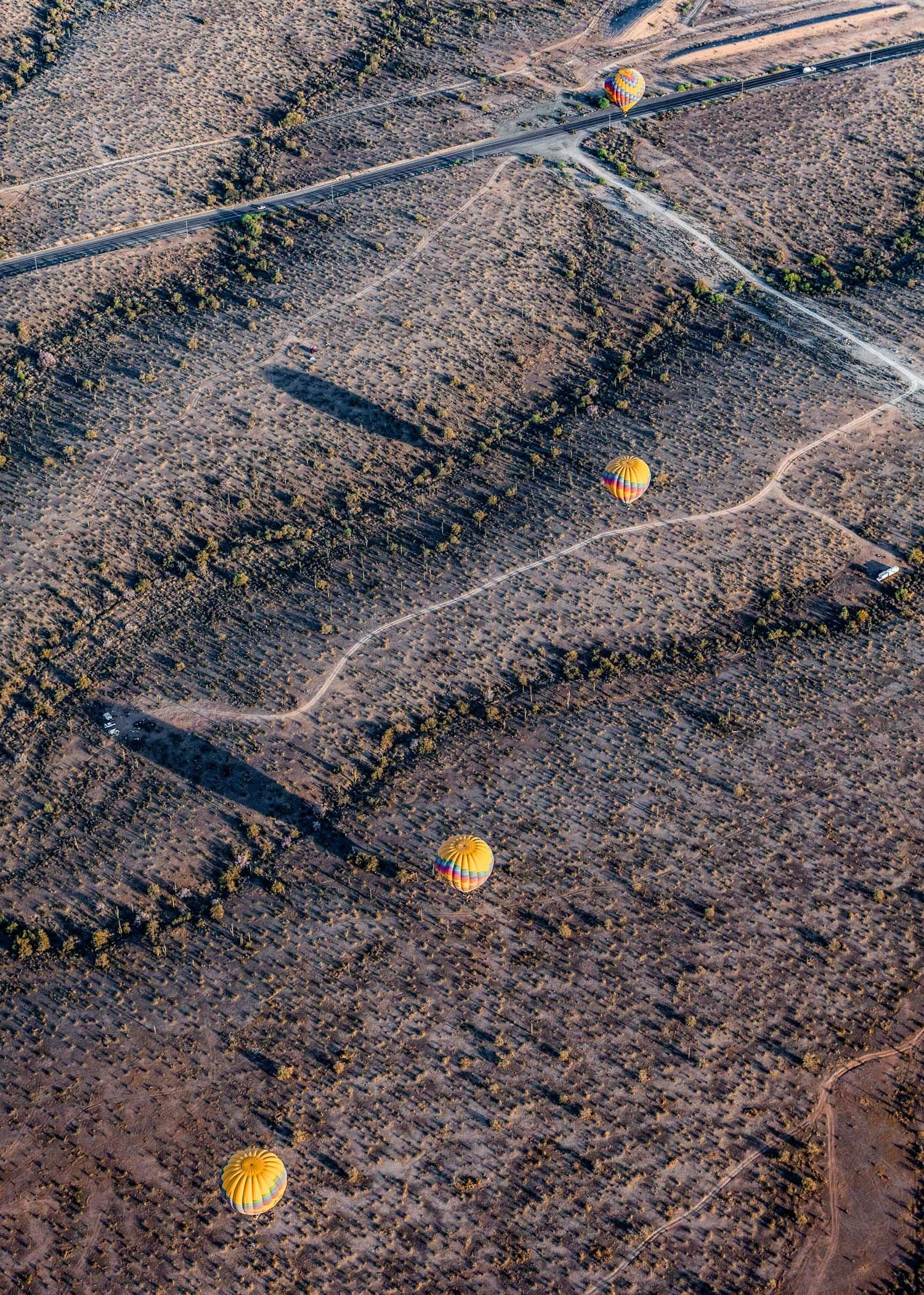 This photograph is from May 17th, 2021 and was captured somewhere near Phoenix, AZ. It’s a photograph of four hot air balloons landing on the ground, photographed from another hot air balloon up above them.