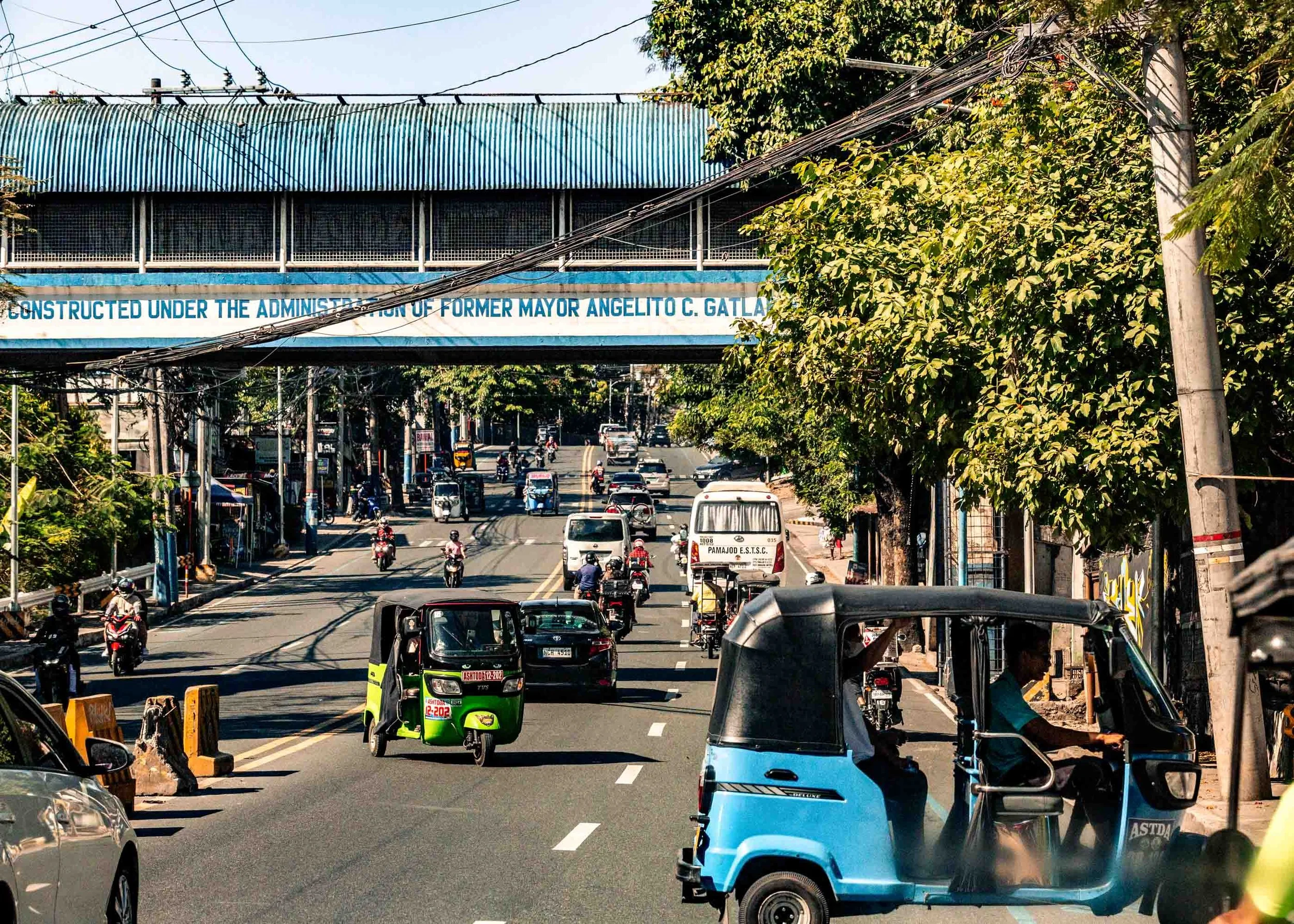 This photograph is from April 18th, 2024, captured on the Marcos Highway in Antipolo City, Philippines. It was the peak of the hot dry season, the air thick with around 75% humidity and temperatures in the low 90s°F (around 34°C.) The view, from the front seat of a van, looks over a mix of local traffic—motorized tricycles and passenger vans—passing under a dense web of utility lines. A blue pedestrian overpass spans the road, framed by the lush foliage of Narra trees.