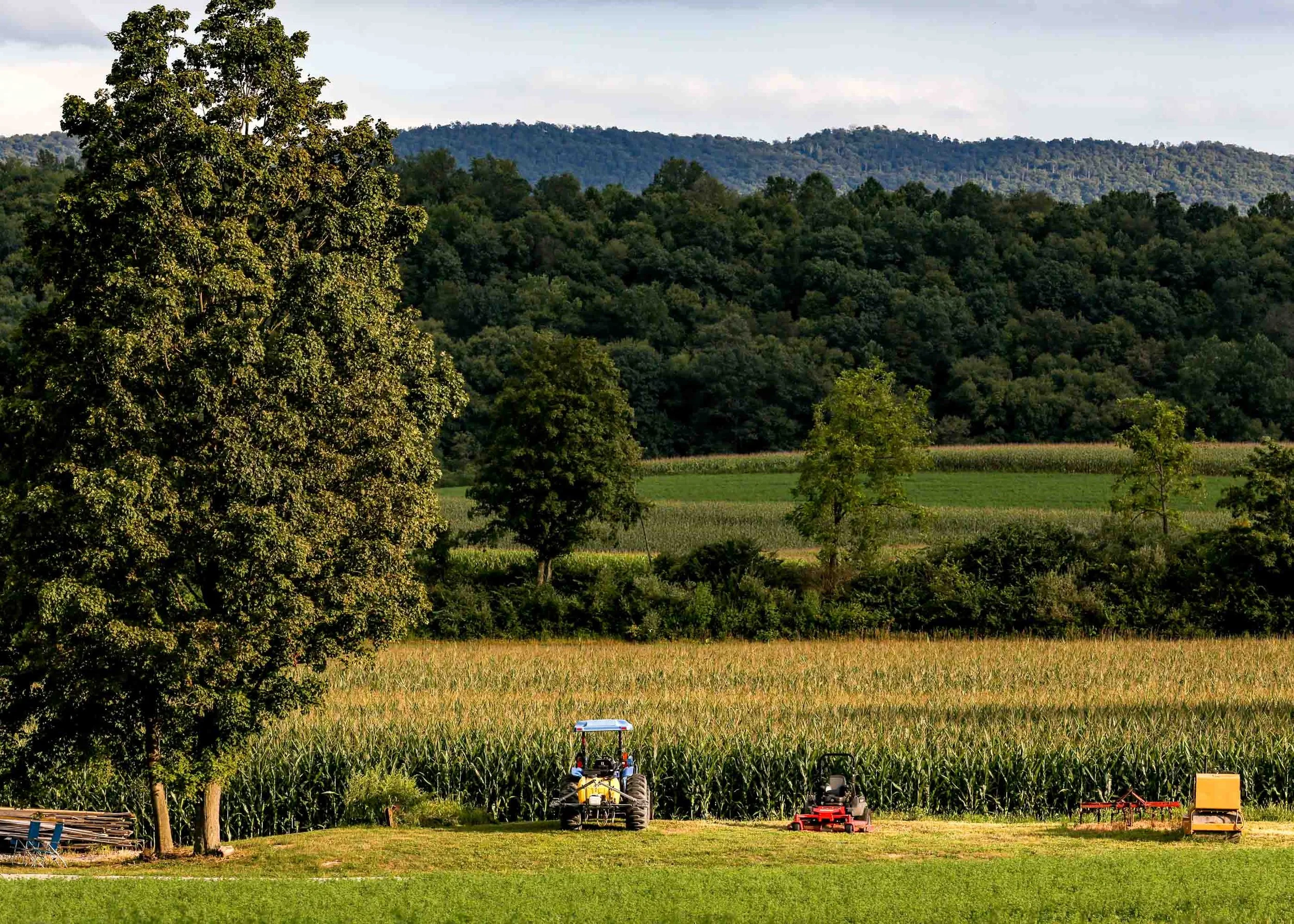 This photograph is from August 23, 2025, captured at the wedding of two friends who moved to south Brooklyn from Pittsburgh around the same time that I moved to north Brooklyn from San Francisco. It’s a photograph of a yellow tractor, a red riding mower, and an orange plough parked in front of a cornfield at Bell Mountain Estates in the Pennsylvania countryside. A forested ridge rises behind a hill of trees in the distance.